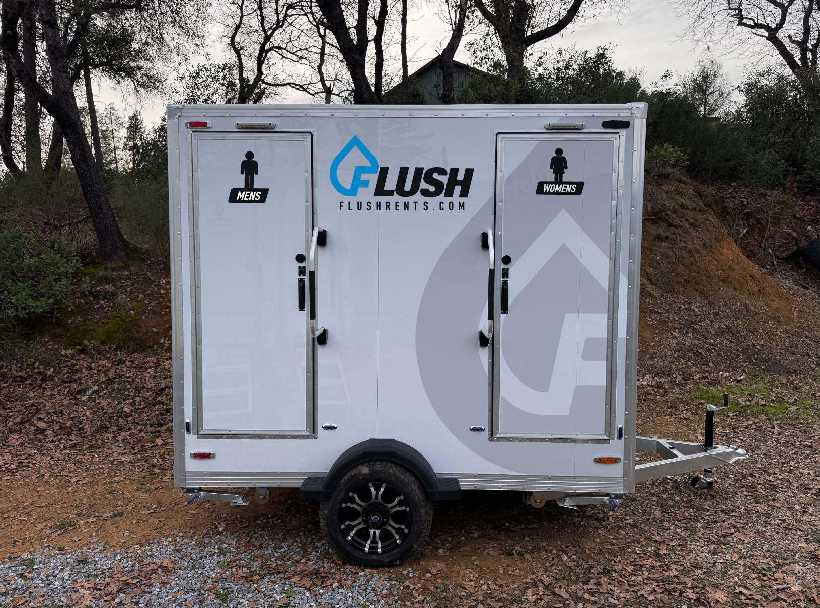 2 Fully Working Stalls: Our air conditioned luxury restroom trailer features 1 female stalls and 1 male stall all equipped with flushing toilets (and Urinal in mens) and working sinks. comes stocked with toilet paper/Hand drying paper towels and liquid hand soap.